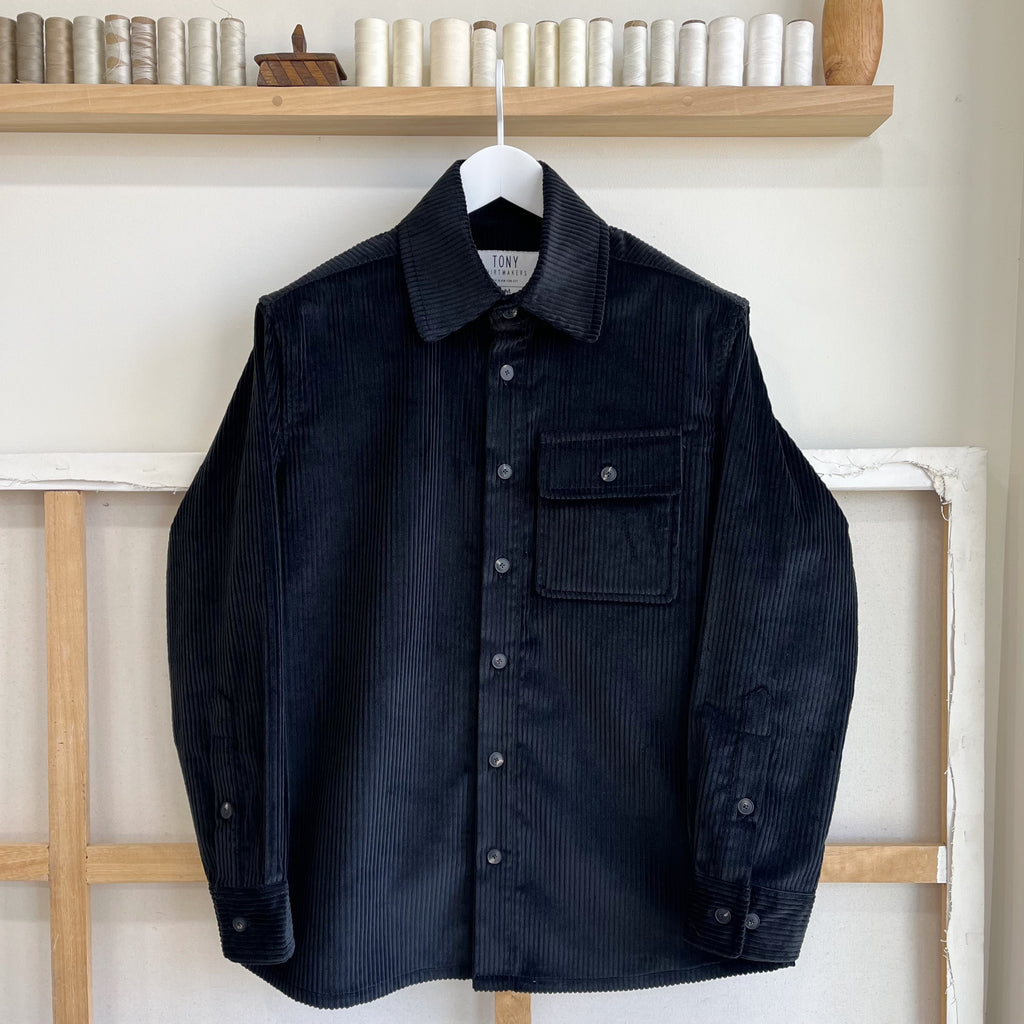 This overshirt is made from a wide, 5 wale corduroy from England. The cord has a velvety sheen with a soft hand feel and a structured drape.
