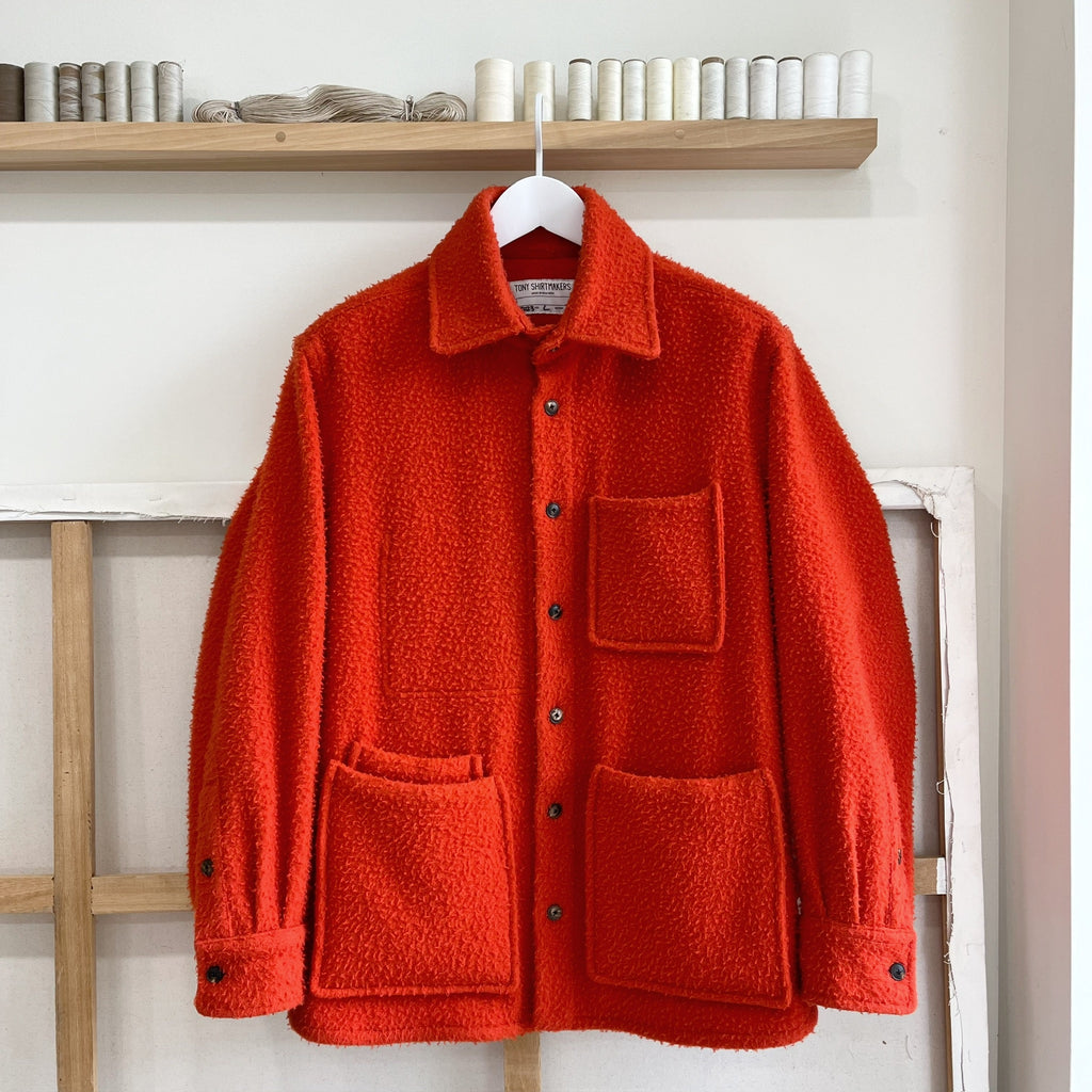 This chore coat is made from a hefty Casentino Wool in a vibrant clementine orange. The fabric is sourced in Italy and characterized by the curls and wisps that give this fabric its amazing texture. Casentino wool is naturally temperature regulating and water resistant.