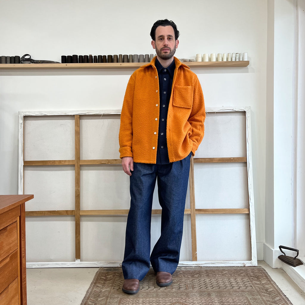 Design features include a French workwear inspired collar, double button cuffs and a locker loop. The single square pocket is a 'Barchetta' style, which means that the hand-sewn top hem gently slopes like the bow of a little boat. The pocket is sewn on floating - the inlaid topstitch gives it a three dimensional look. The sleeves are cut wide to accommodate layering, with an adjustable double button cuff (tighter for a more shirt-like fit, looser for a more jacket-like fit). The back features a locker loop for hanging by the door. Finished with beige mother of pearl buttons, each hand-sewn with a crow foot stitch.