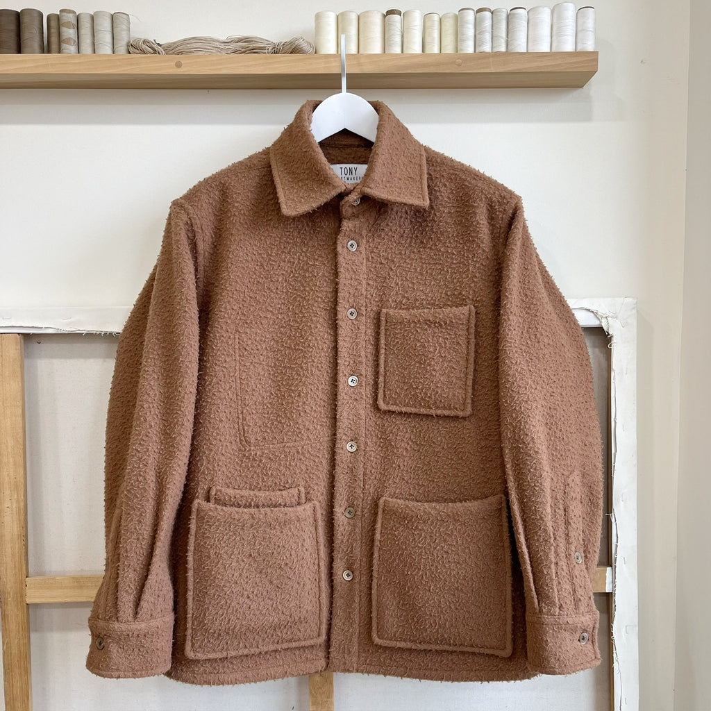 This chore coat is made from a hefty Casentino Wool in deep tan camel. The fabric is sourced in Italy and characterized by the curls and wisps that give this fabric its amazing texture. Casentino wool is naturally temperature regulating and water resistant.