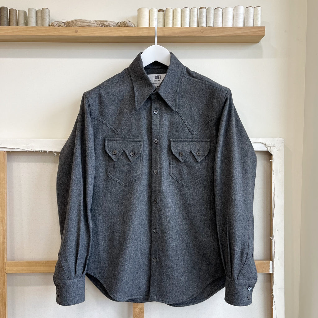 This western shirt is made from a dead-stock wool cashmere, sourced in NYC. It has a super soft hand feel with a hairy nap and heavy drape.