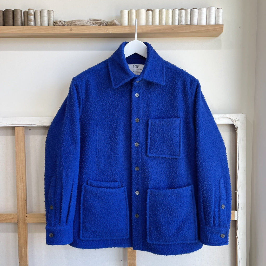 This chore coat is made from a hefty Casentino Wool in a vibrant porcelain blue. The fabric is sourced in Italy and characterized by the curls and wisps that give this fabric its amazing texture. Casentino wool is naturally temperature regulating and water resistant.