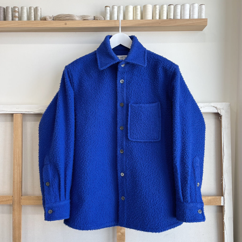 Design features include a French workwear inspired collar, double button cuffs and a locker loop. The single square pocket is a 'Barchetta' style, which means that the hand-sewn top hem gently slopes like the bow of a little boat. The pocket is sewn on floating - the inlaid topstitch gives it a three dimensional look. The sleeves are cut wide to accommodate layering, with an adjustable double button cuff (tighter for a more shirt-like fit, looser for a more jacket-like fit). The back features a locker loop for hanging by the door. Finished with matte smoked trocas shell buttons, each hand-sewn with a crow foot stitch.