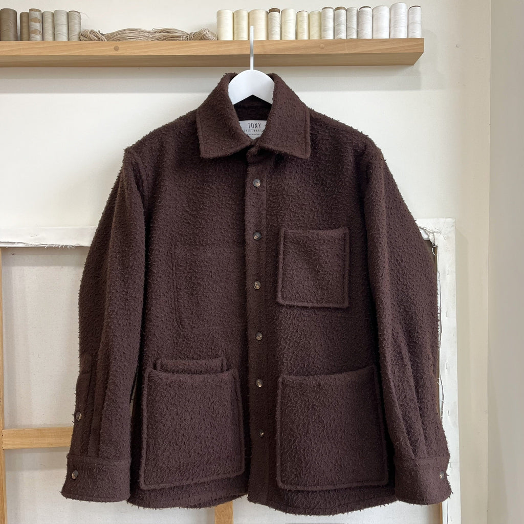 This chore coat is made from a hefty Casentino Wool in a rich dark chocolate. The fabric is sourced in Italy and characterized by the curls and wisps that give this fabric its amazing texture. Casentino wool is naturally temperature regulating and water resistant.