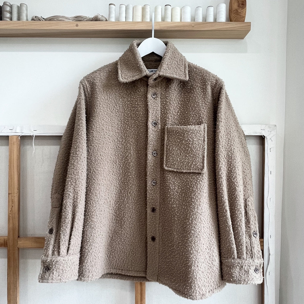 Design features include a French workwear inspired collar, double button cuffs and a locker loop. The single square pocket is a 'Barchetta' style, which means that the hand-sewn top hem gently slopes like the bow of a little boat. The pocket is sewn on floating - the inlaid topstitch gives it a three dimensional look. The sleeves are cut wide to accommodate layering, with an adjustable double button cuff (tighter for a more shirt-like fit, looser for a more jacket-like fit). The back features a locker loop for hanging by the door. Finished with matte brown trocas buttons, each hand-sewn with a crow foot stitch.