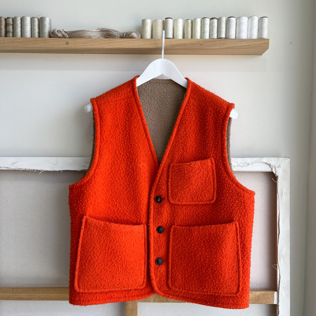 This reversible vest is made from a hefty Casentino Wool. The wool is sourced in Italy and characterized by the curls and wisps that give it an amazing texture. It is naturally temperature regulating and water resistant. One side is a neutral and classic light camel. The other is a vibrant clementine orange for a pop of color.