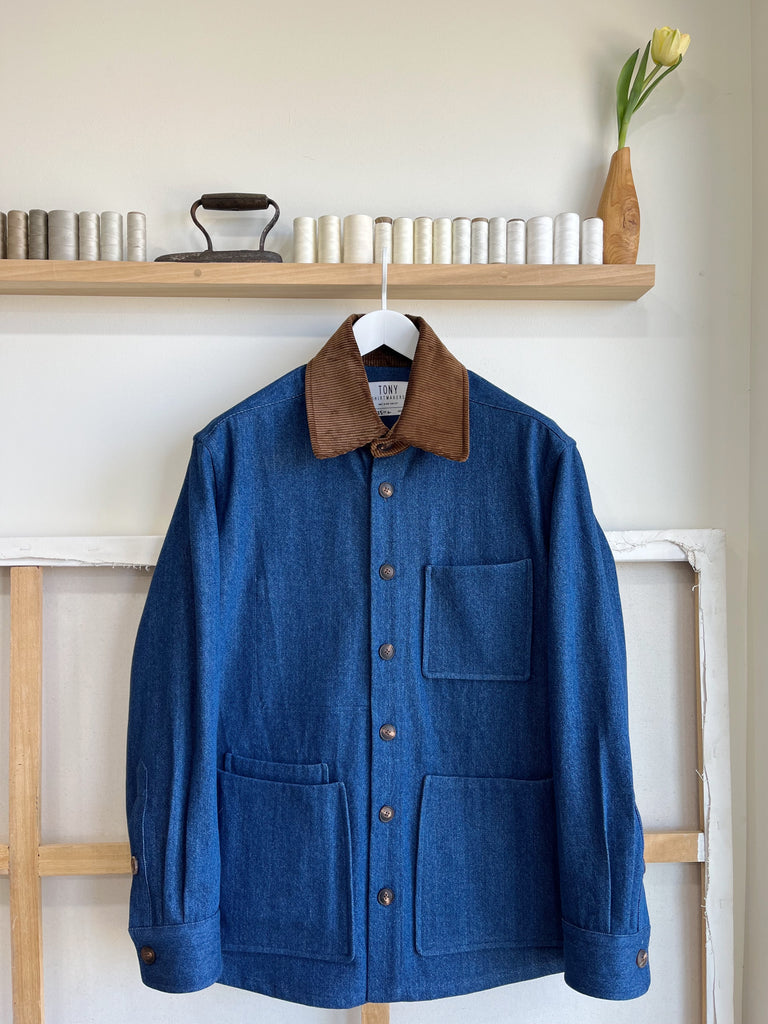 This chore coat is made from a washed American denim - a hardy and tough fabric that wears beautifully over time, eventually revealing hard earned creasing and distressing. The collar and inner cuffs are a caramel, velvety soft wide wale corduroy from England.