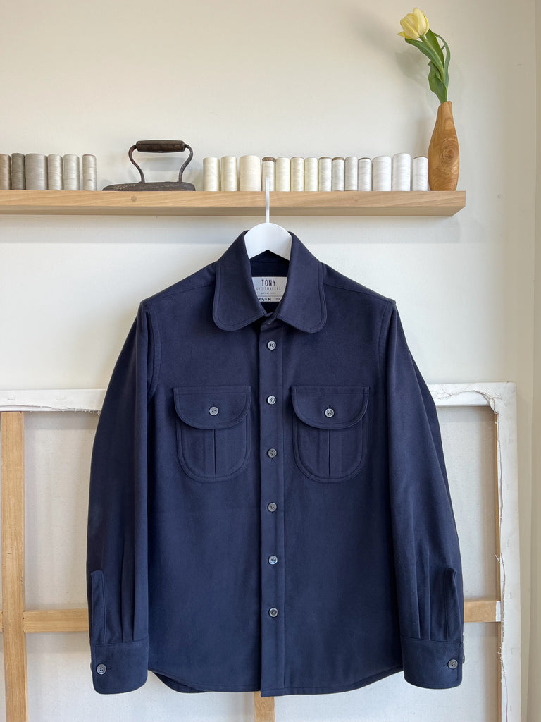 This is our classic Shirt Jacket made from a dense 100% cotton moleskin from England in a deep indigo blue. Moleskin is soft and sueded to the touch and makes a wonderful all season fabric.