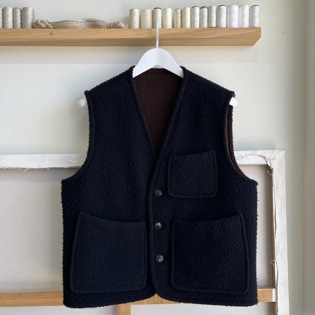 This reversible vest is made from a hefty Casentino Wool. The wool is sourced in Italy and characterized by the curls and wisps that give it an amazing texture. It is naturally temperature regulating and water resistant. One side is a deep, dark chocolate brown, the other is a saturated black.