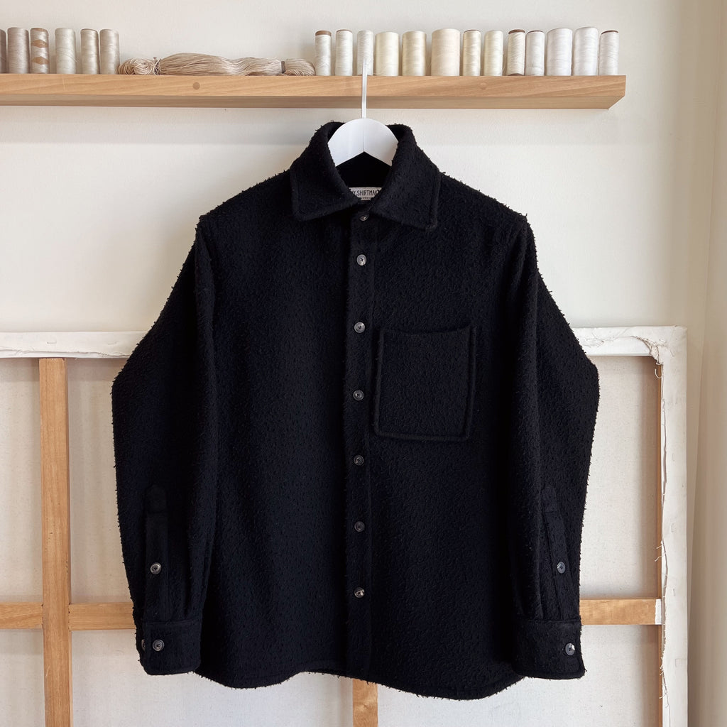 Design features include a French workwear inspired collar, double button cuffs and a locker loop. The single square pocket is a 'Barchetta' style, which means that the hand-sewn top hem gently slopes like the bow of a little boat. The pocket is sewn on floating - the inlaid topstitch gives it a three dimensional look. The sleeves are cut wide to accommodate layering, with an adjustable double button cuff (tighter for a more shirt-like fit, looser for a more jacket-like fit). The back features a locker loop for hanging by the door. Finished with matte genuine horn buttons, each hand-sewn with a crow foot stitch.
