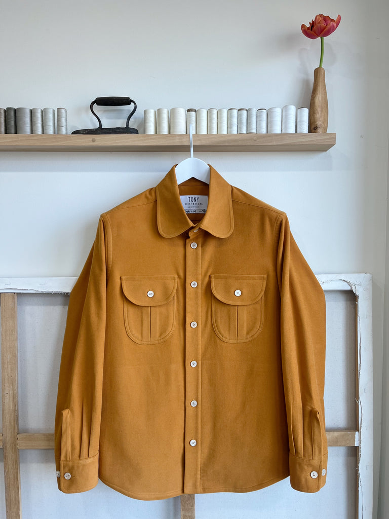 This is our classic Shirt Jacket made from a dense 100% cotton moleskin from England in a saturated shade of ochre yellow. Moleskin is soft and sueded to the touch and makes a wonderful all season fabric.