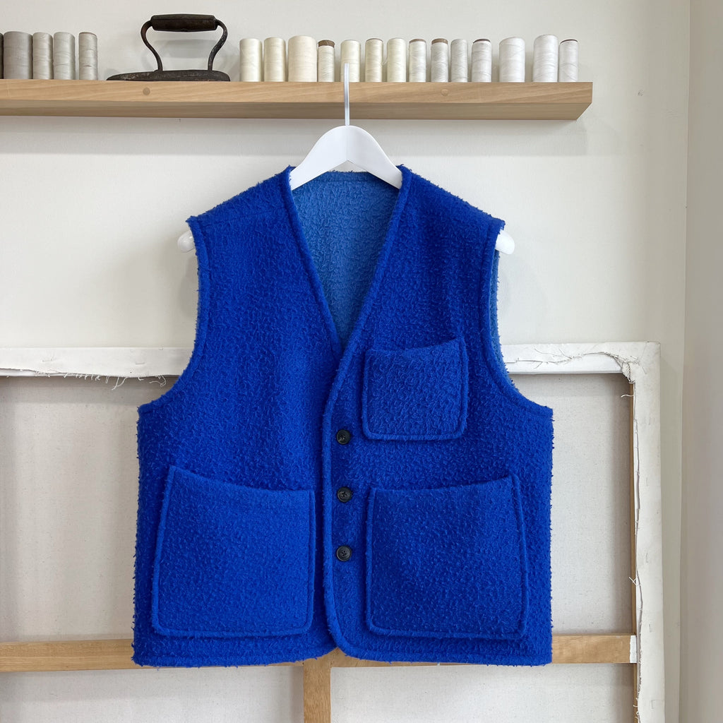This reversible vest is made from a hefty Casentino Wool. The wool is sourced in Italy and characterized by the curls and wisps that give it an amazing texture. It is naturally temperature regulating and water resistant. One side is a cheerful periwinkle blue. The other is a vibrant 'china' (as in the plates) blue.