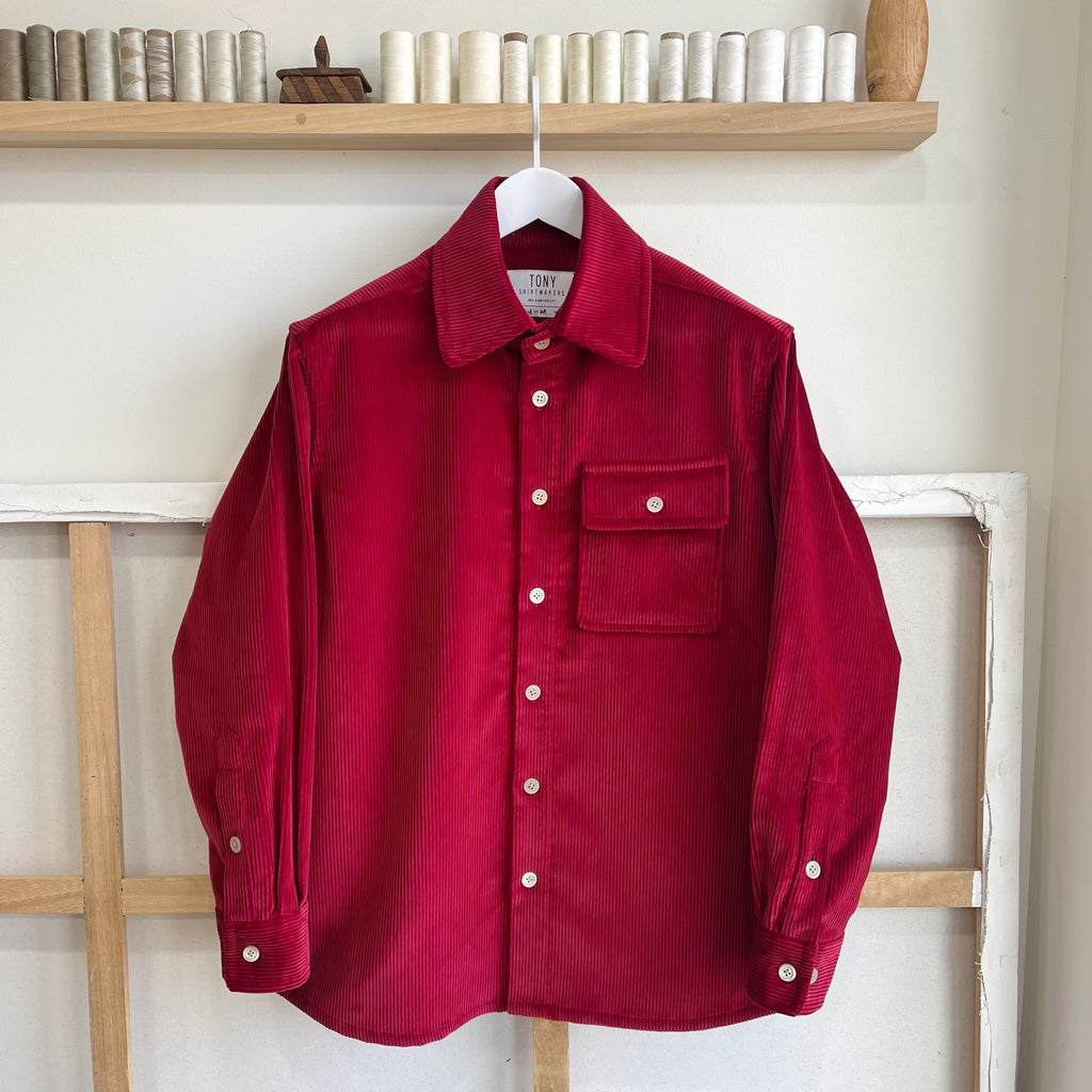 This overshirt is made from a heavy weight, 8 wale corduroy from England. The cord has a velvety sheen with a soft hand feel and a very structured drape (16.5 Oz) that will slowly break down and soften over time. Design features include a French workwear inspired collar, double button cuffs and a locker loop. The single square pocket is a 'Barchetta' style, which means that the hand-sewn top hem gently slopes like the bow of a little boat. This shape is carried over into the flap, set on an incline. The pocket is sewn on floating - the inlaid topstitch gives it a three dimensional look. The sleeves are cut wide to accommodate layering, with an adjustable double button cuff (tighter for a more shirt-like fit, looser for a more jacket-like fit). The back features a locker loop for hanging by the door. Finished with matte stone trocas shell buttons, each hand-sewn with a crow foot stitch.
